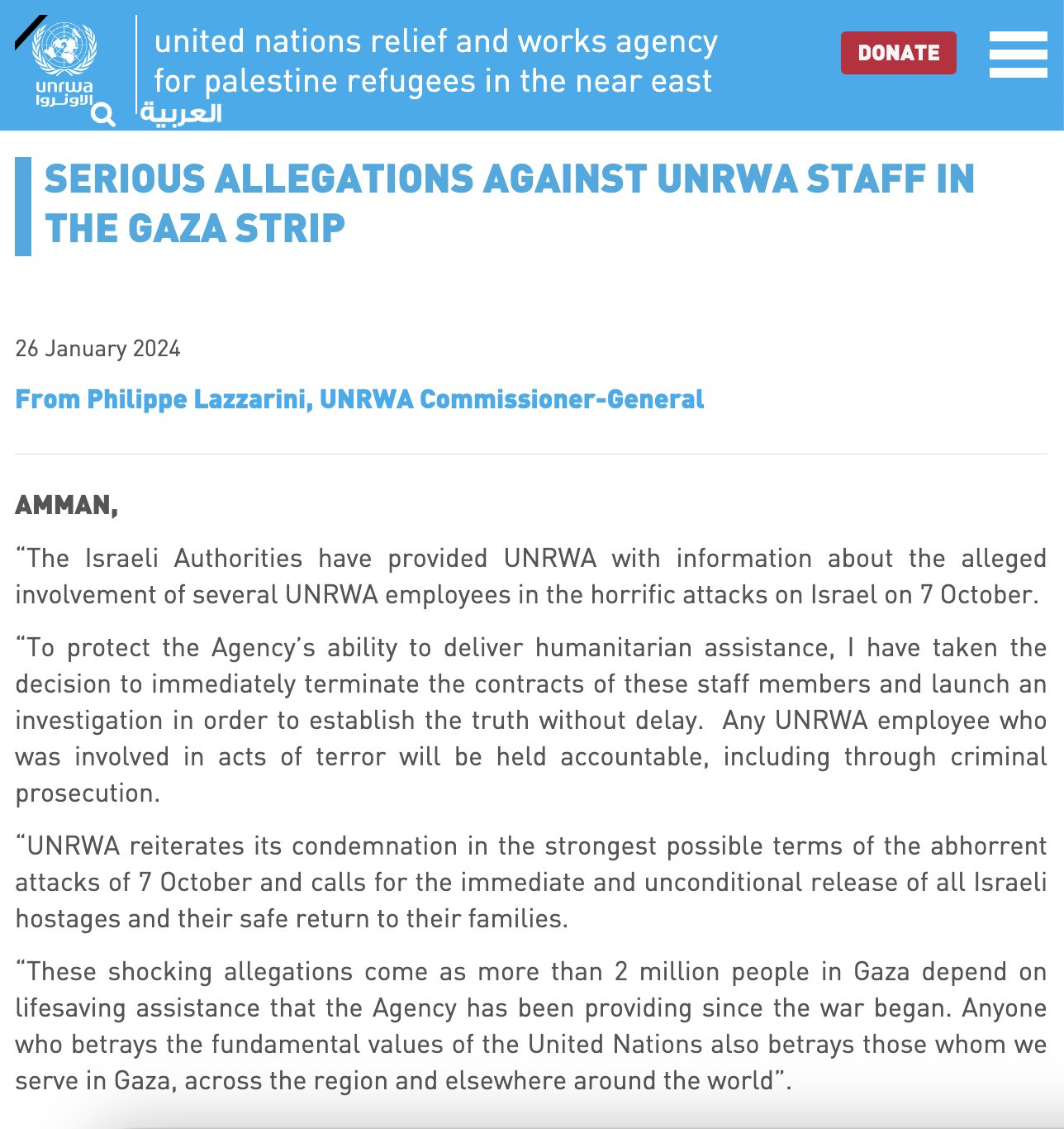 Ammani értesülés szerint az ENSZ ügynöksége hitelesnek és igazoltnak találta az Izrael által bemutatott bizonyítékokat. Kifejezte szándékát, hogy kizárólag a gázai övezetben rekedt 2 millió palesztin lakos életfeltételeinek enyhítése lehet a szervezet egyetlen célja.