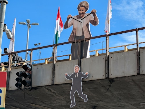 Nyugati pályaudvar. A felüljárón álló Ursula von der Leyen figurája bábozik Magyar Péterrel.