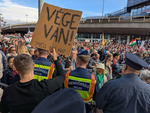 Feltűnt egy ellentüntető, akit rendőrök védenek a békemenetesektől. Az illető egy kartonra írta fel, hogy még 170 nap, és vége van, utalva ezzel a 2026-os parlamenti választásokra, illetve a Fidesz addigra 16 éves uralmának (esetleges) végére. Tudósítónk elmondta, hogy a békemenetesek azt kiabálták neki, hogy "majd amikor elvisznek katonának, akkor sírni fogsz", illetve hogy "a pofáját szét kéne verni az ilyen szar embernek".